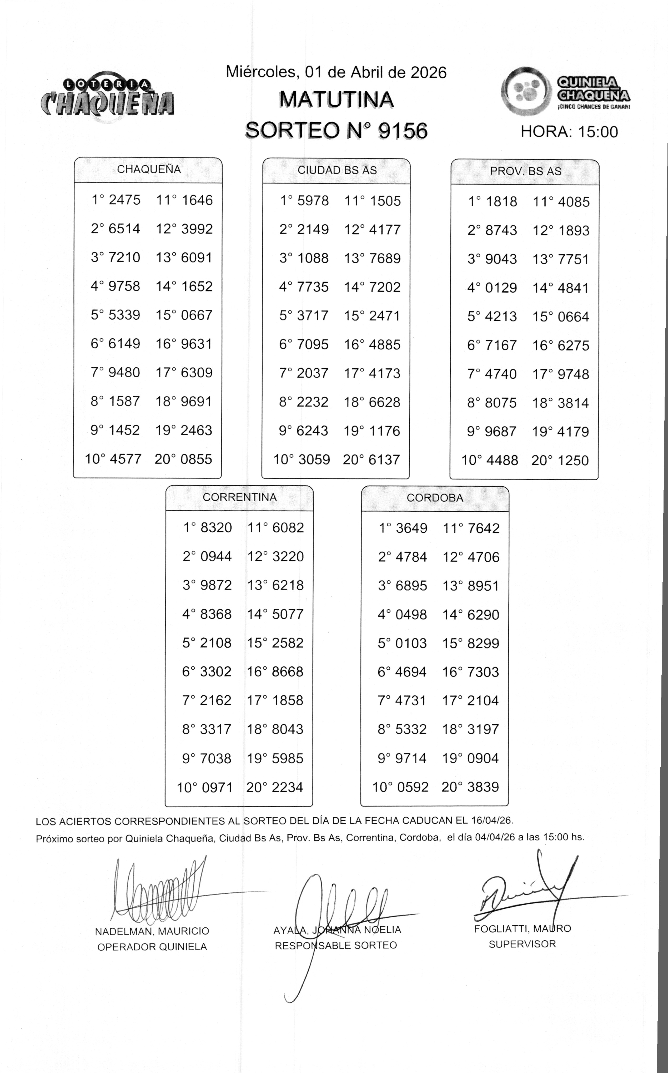 Nro de Sorteo: 9156