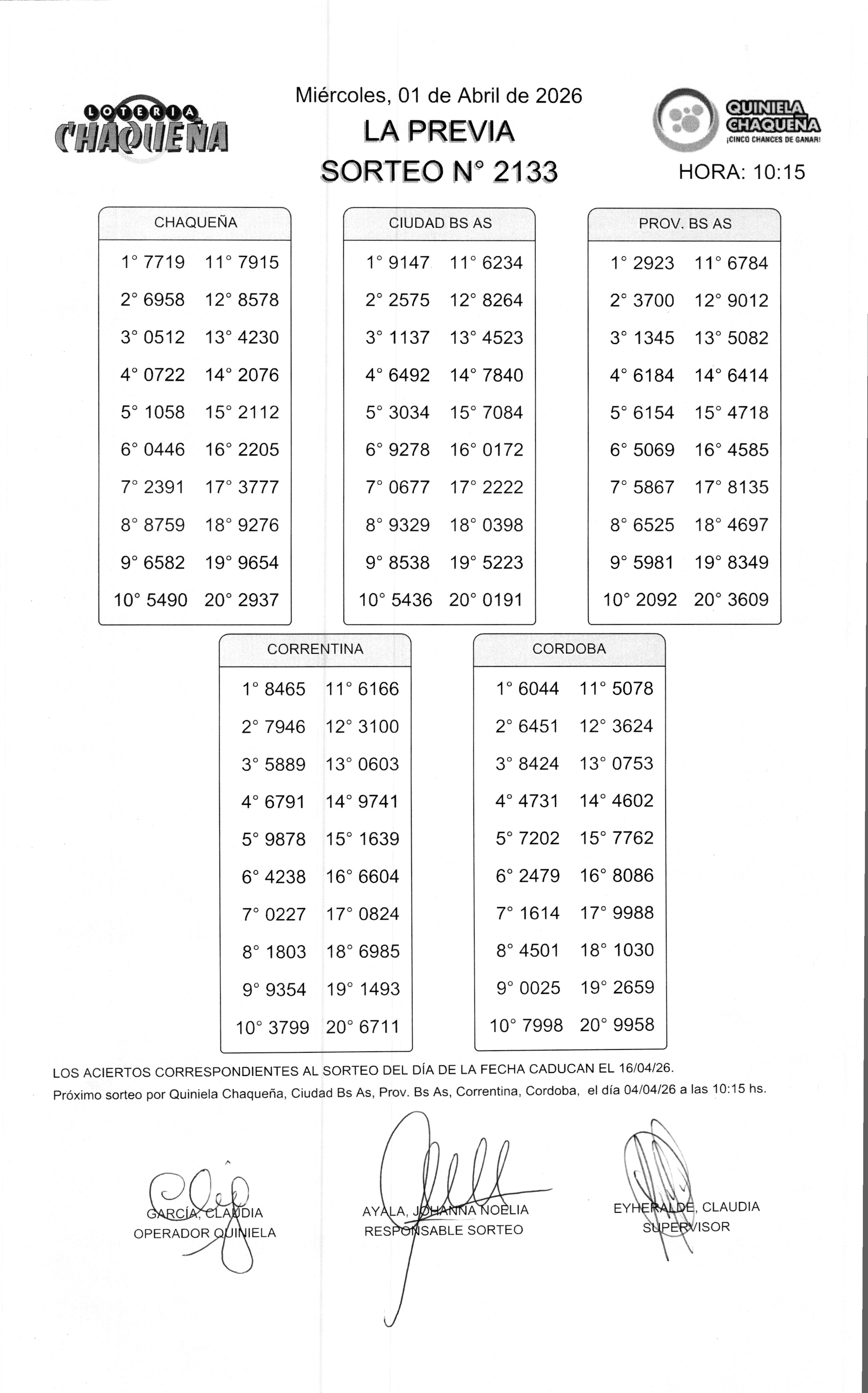 - N° de Sorteo: 2133