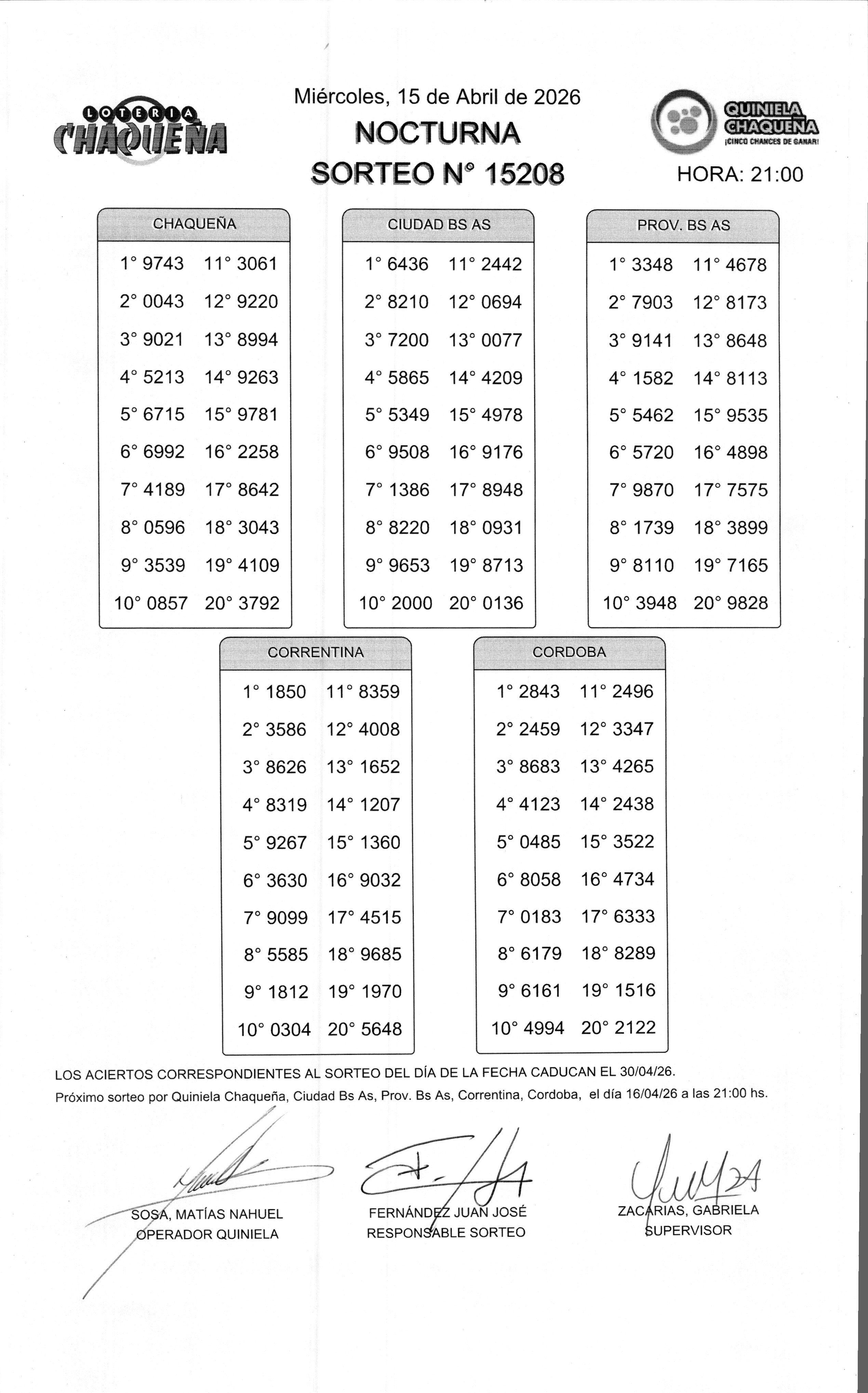 - N° de Sorteo: 15208