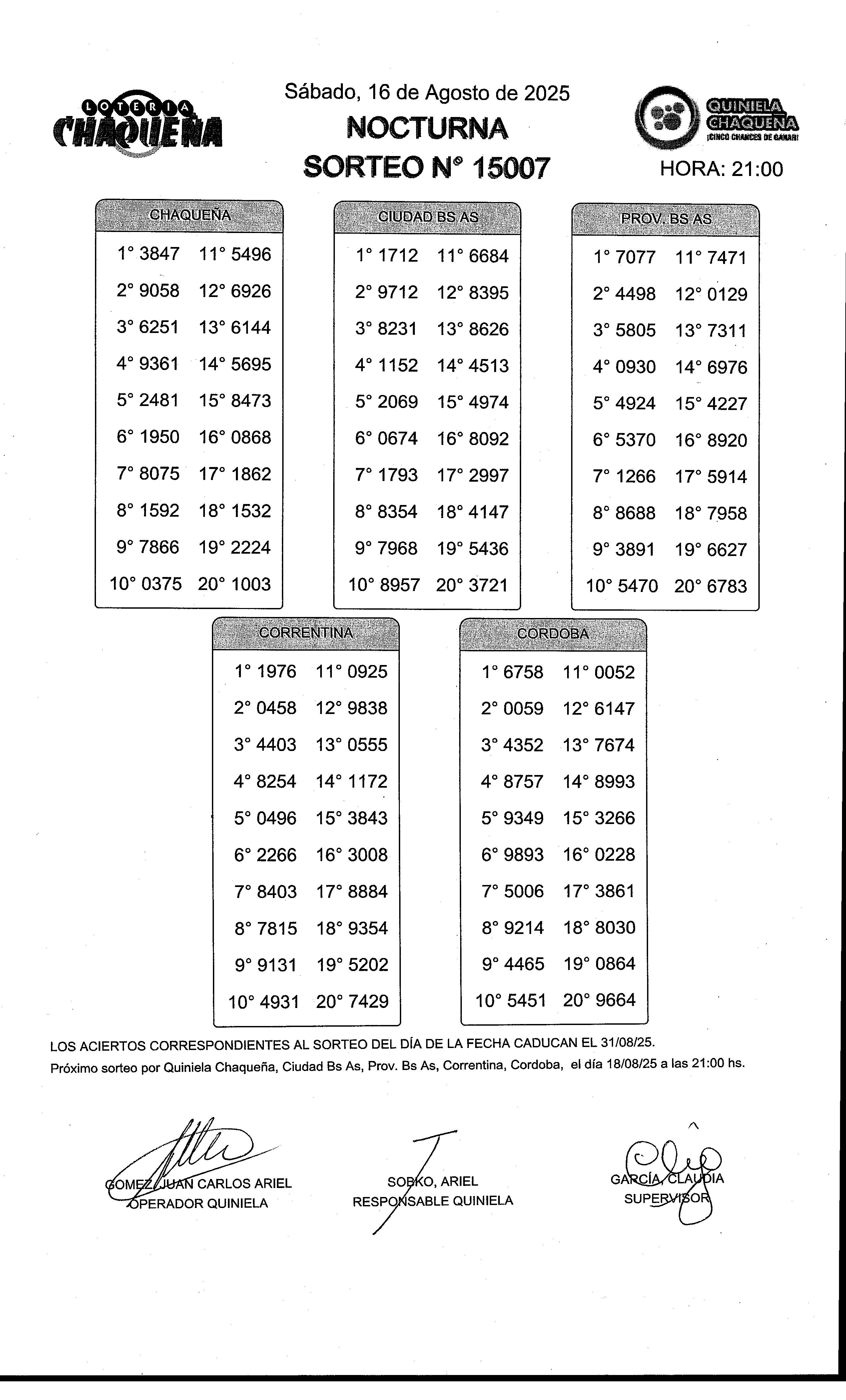 - N° de Sorteo: 15007