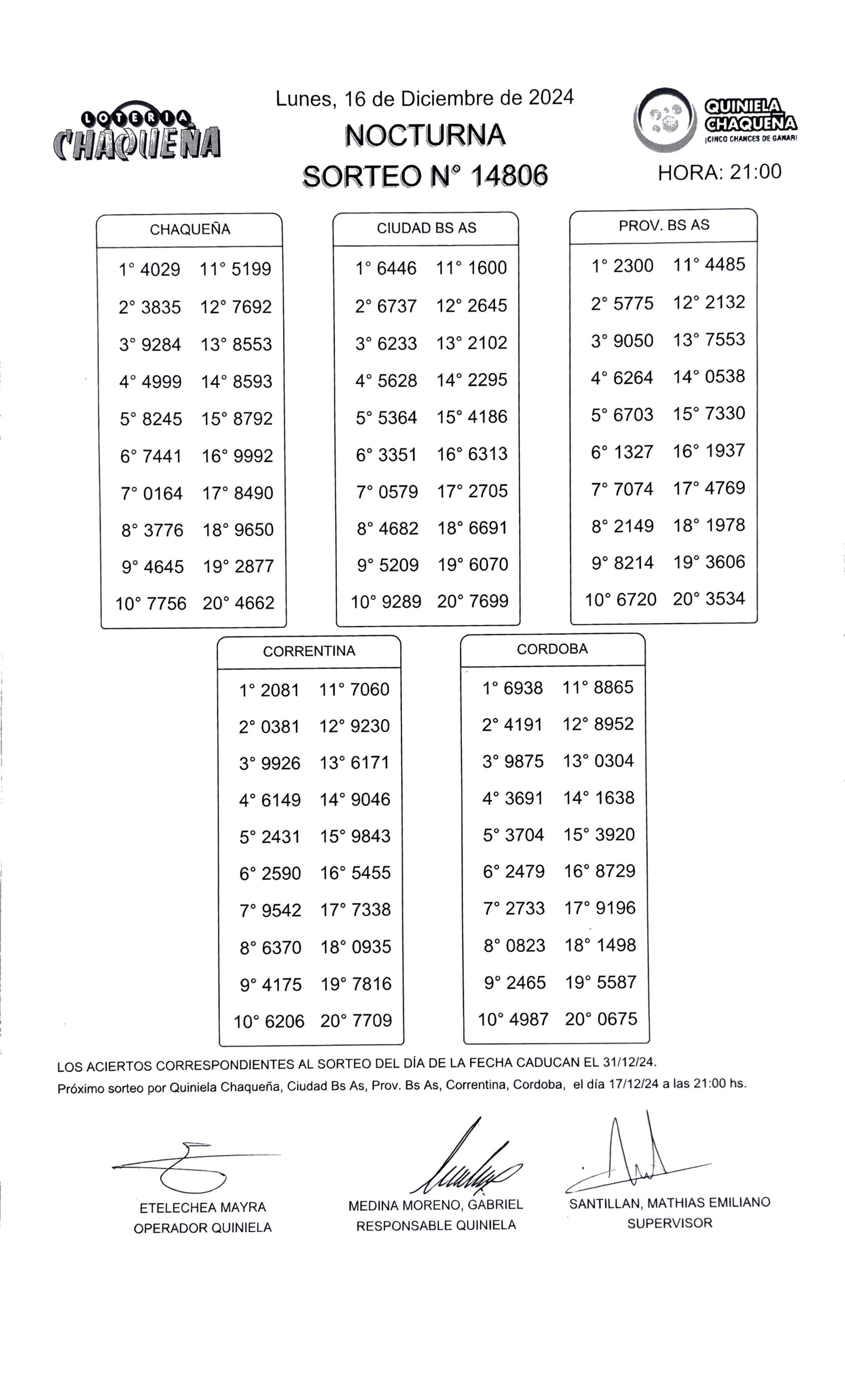 - N° de Sorteo: 14806