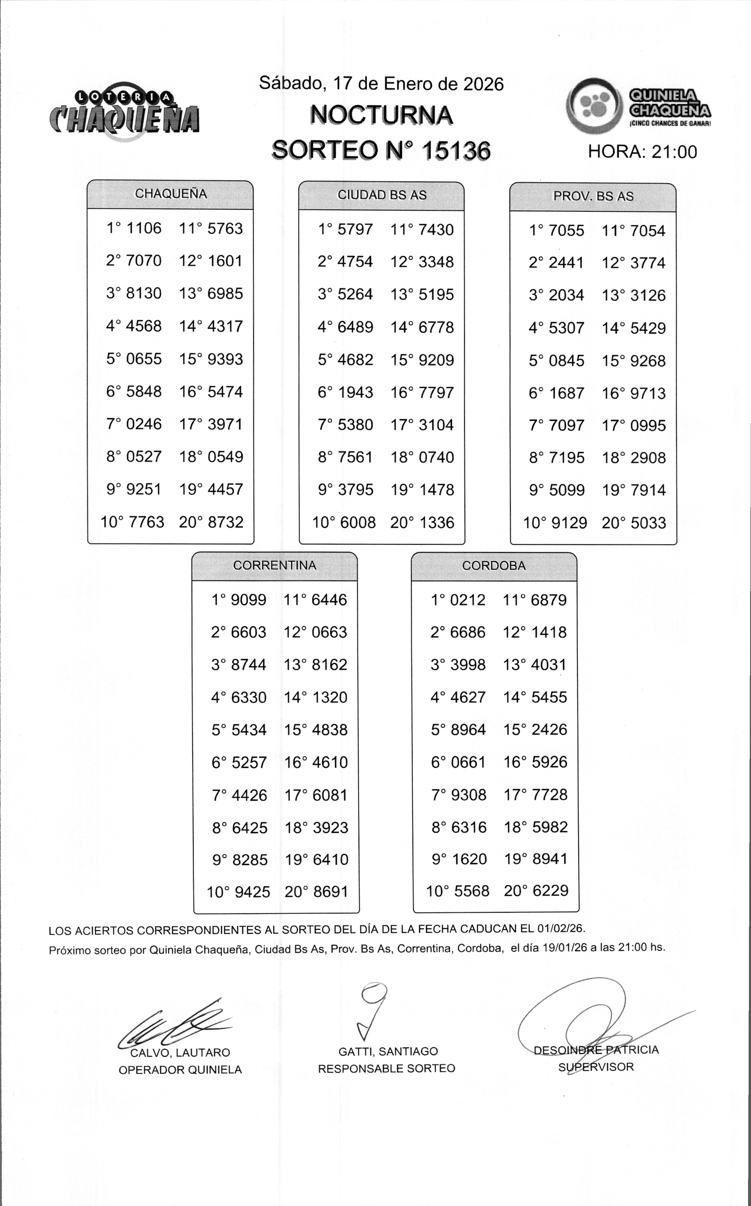 Nro de Sorteo: 15136