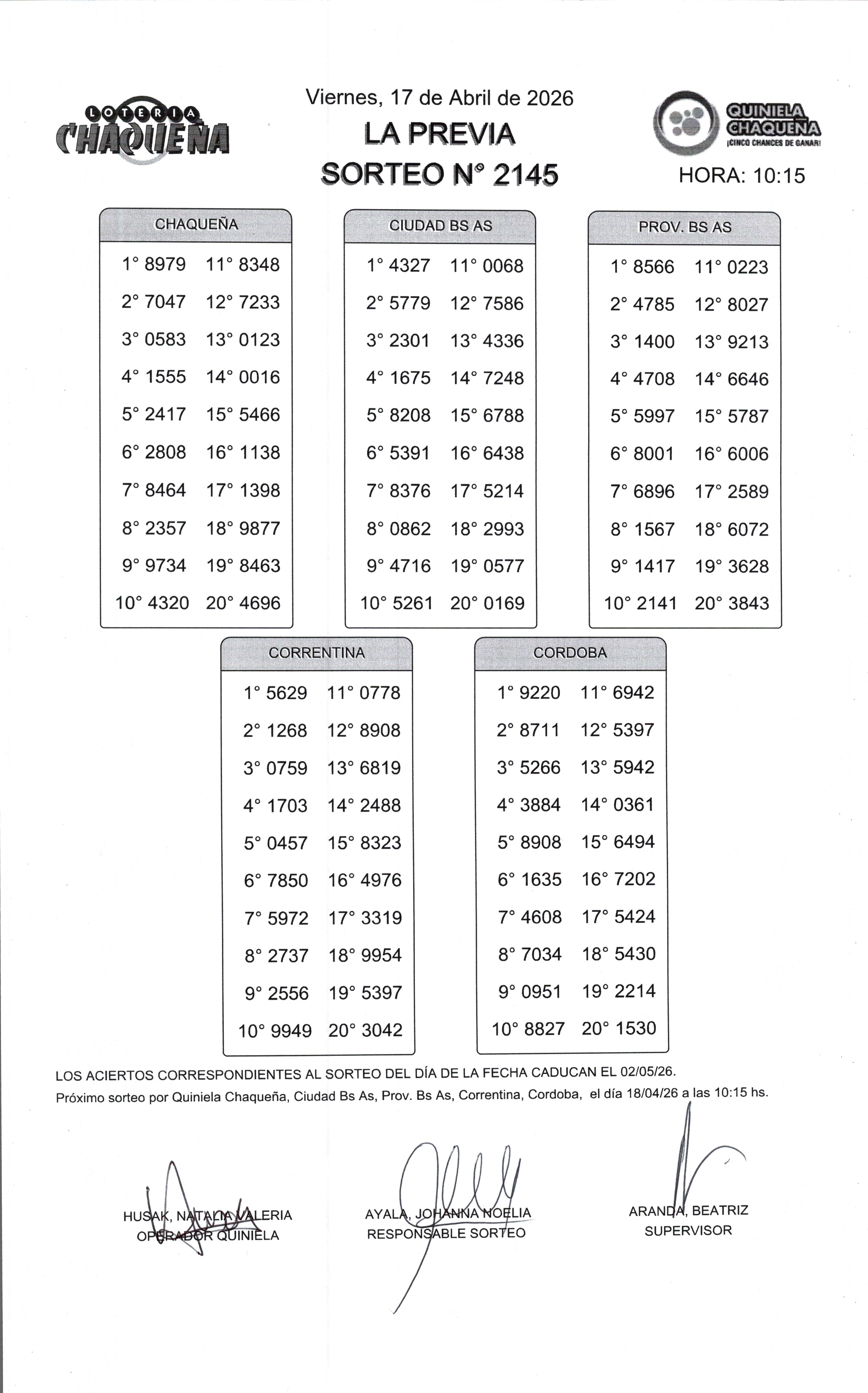 - N° de Sorteo: 2145