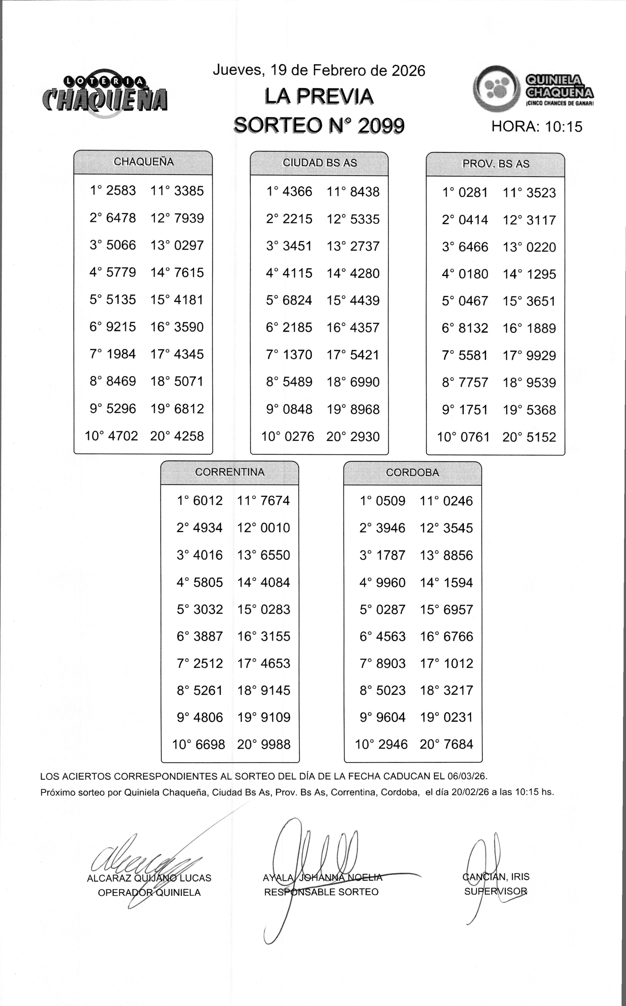 Nro de Sorteo: 2099