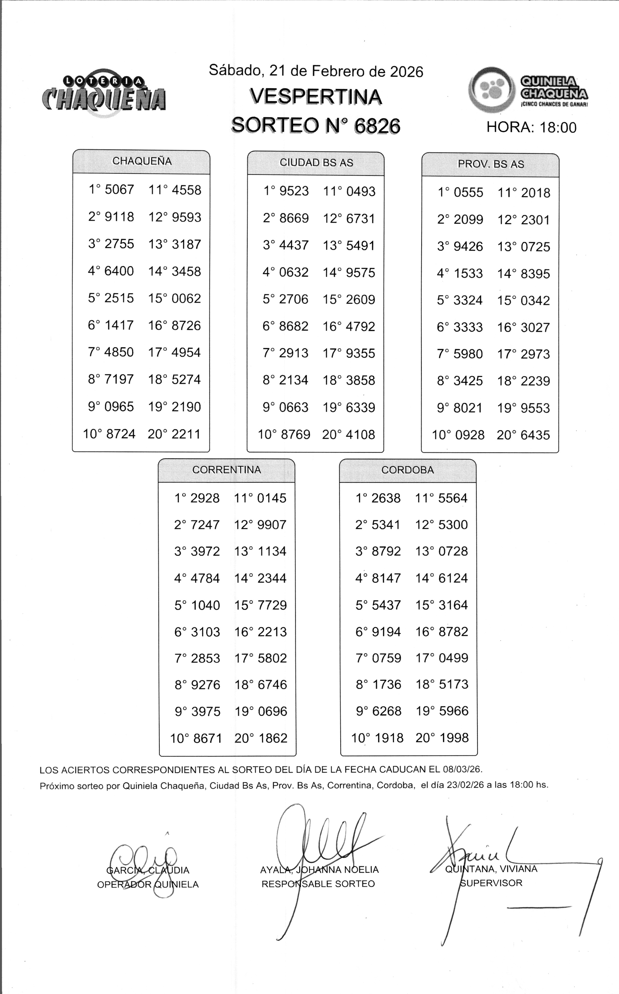 - N° de Sorteo: 6826