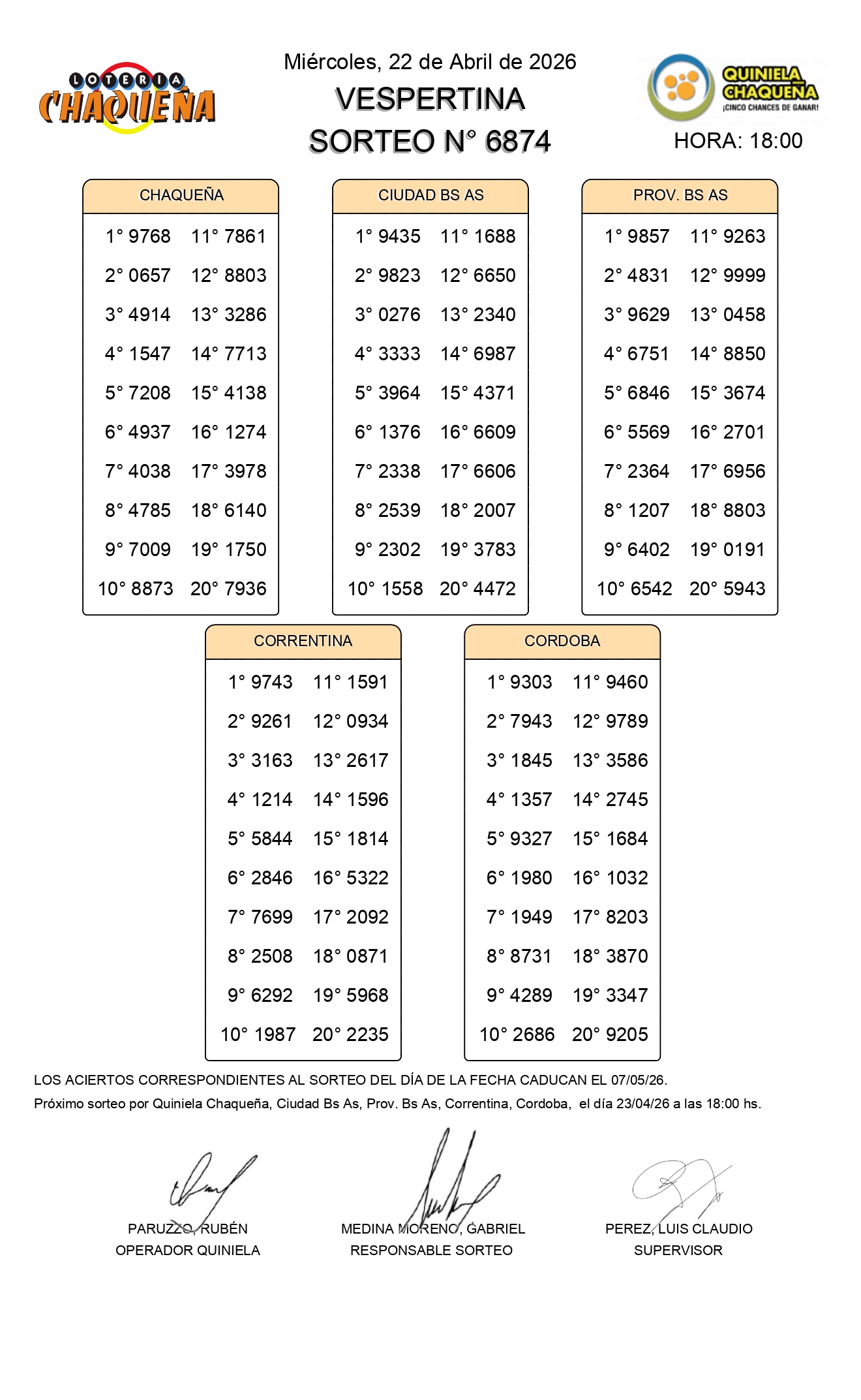 - N° de Sorteo: 6874