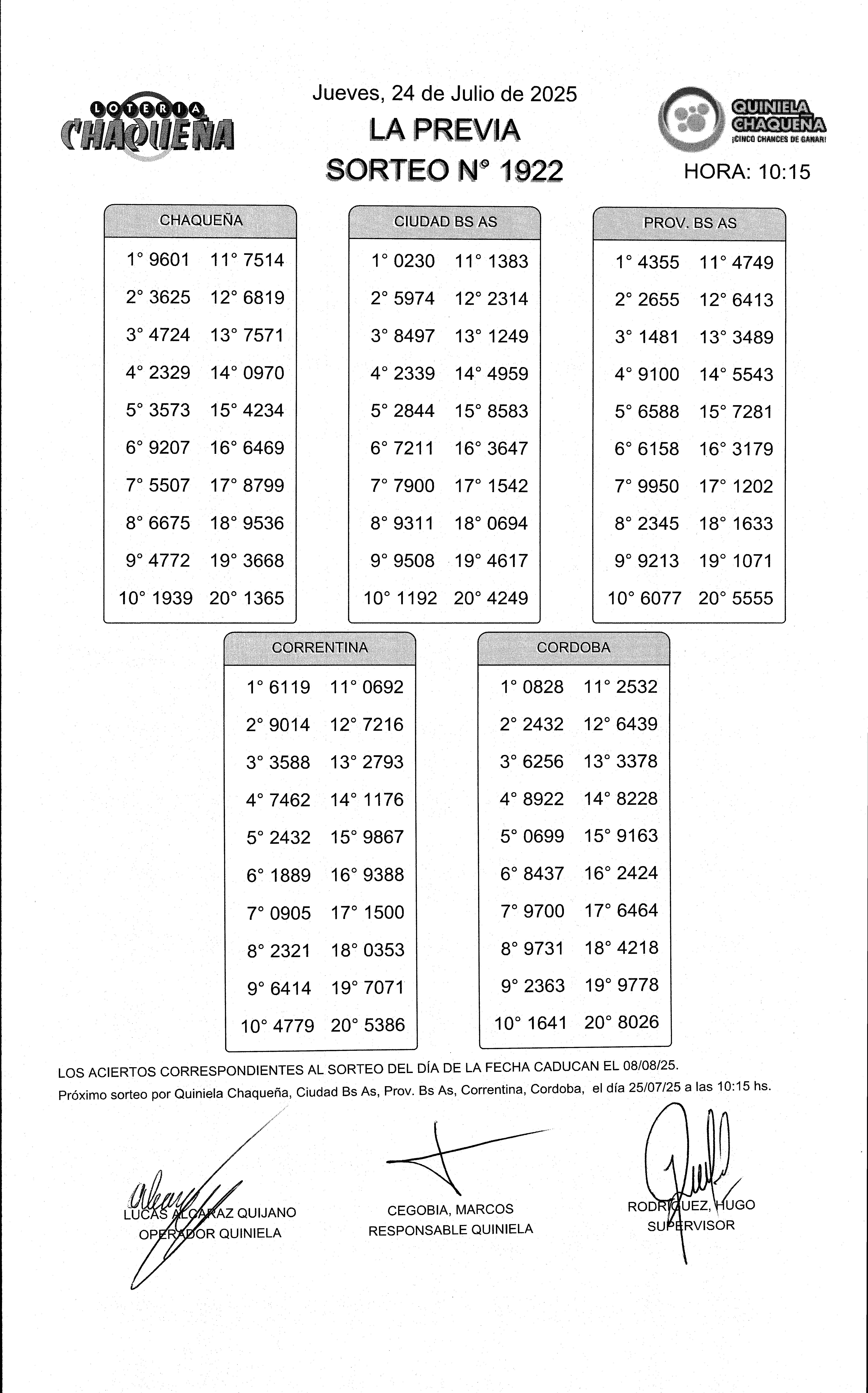 - N° de Sorteo: 1922