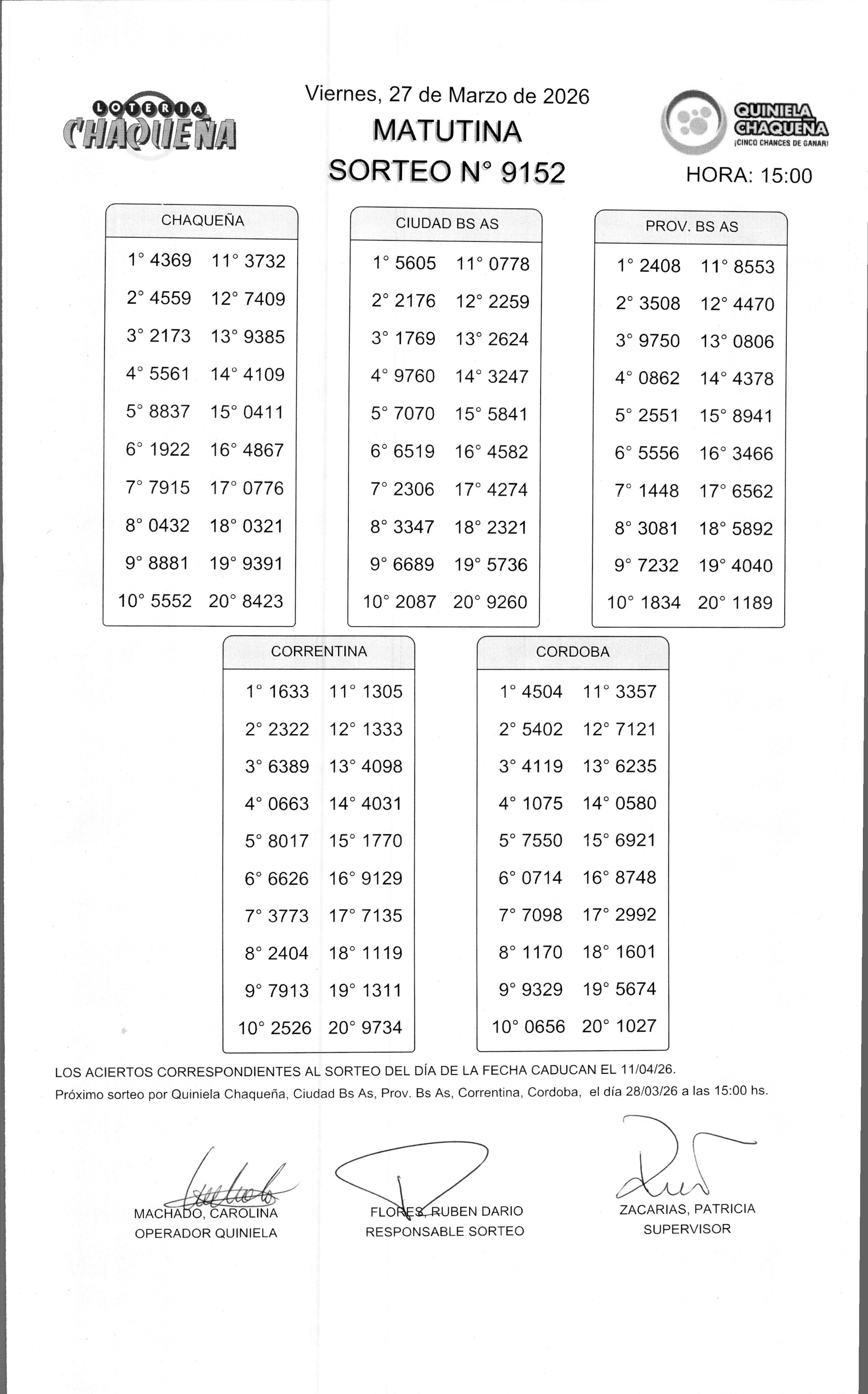Nro de Sorteo: 9152