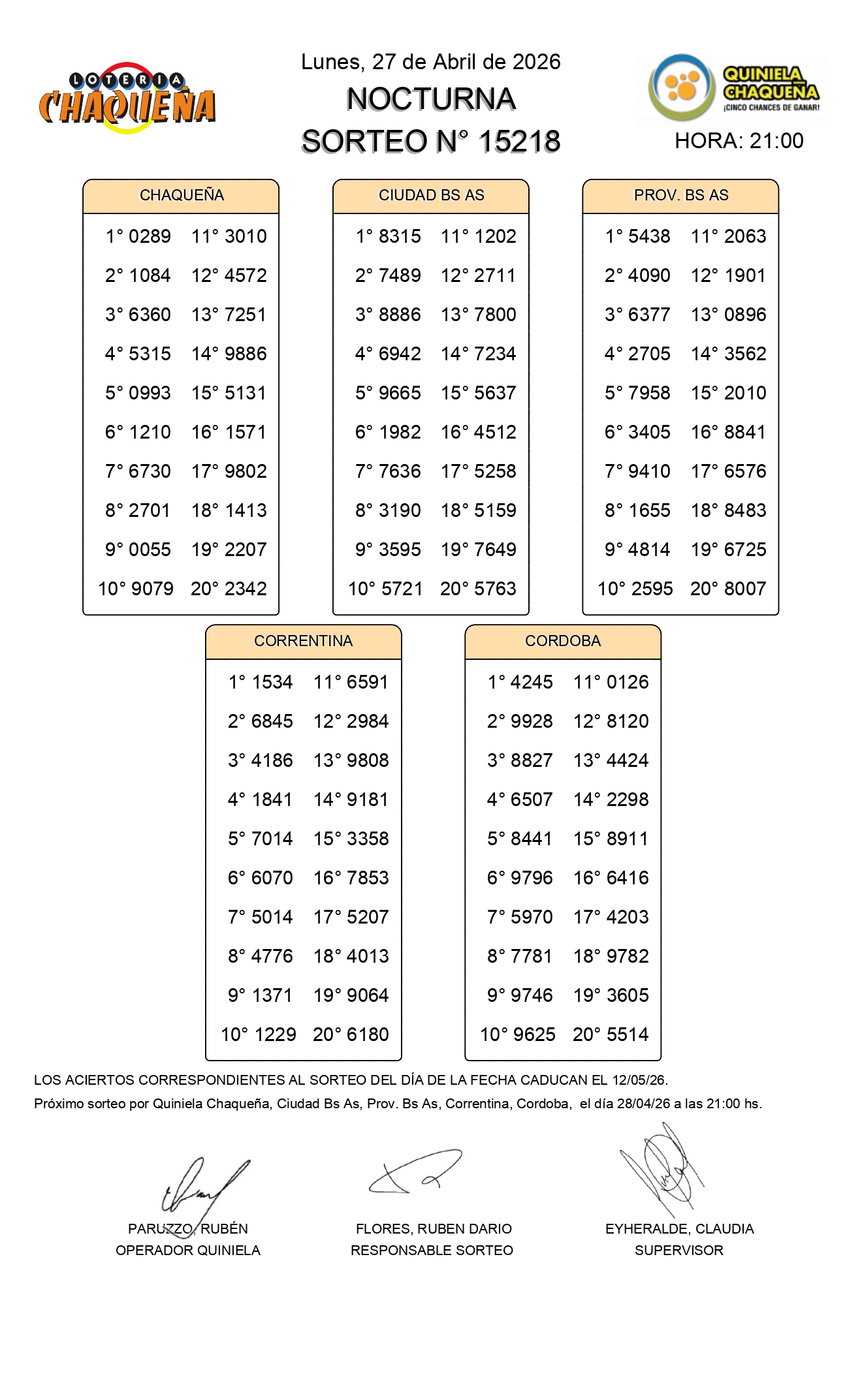 - N° de Sorteo: 15218