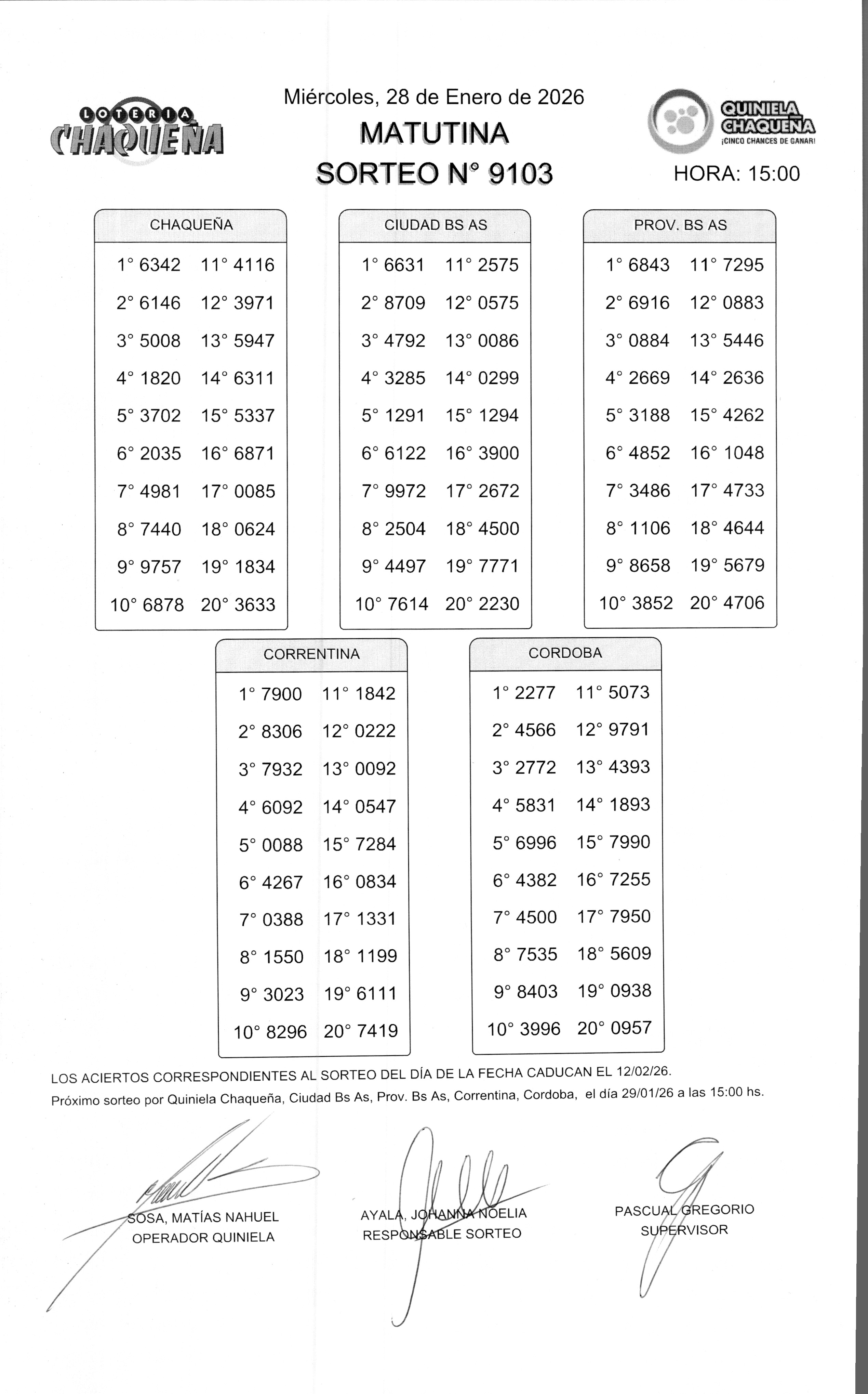 Nro de Sorteo: 9103