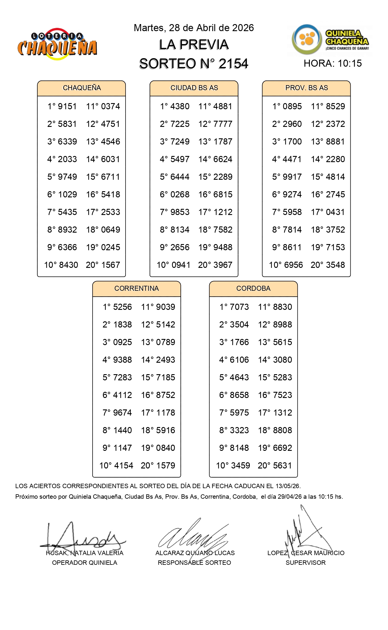 - N° de Sorteo: 2154