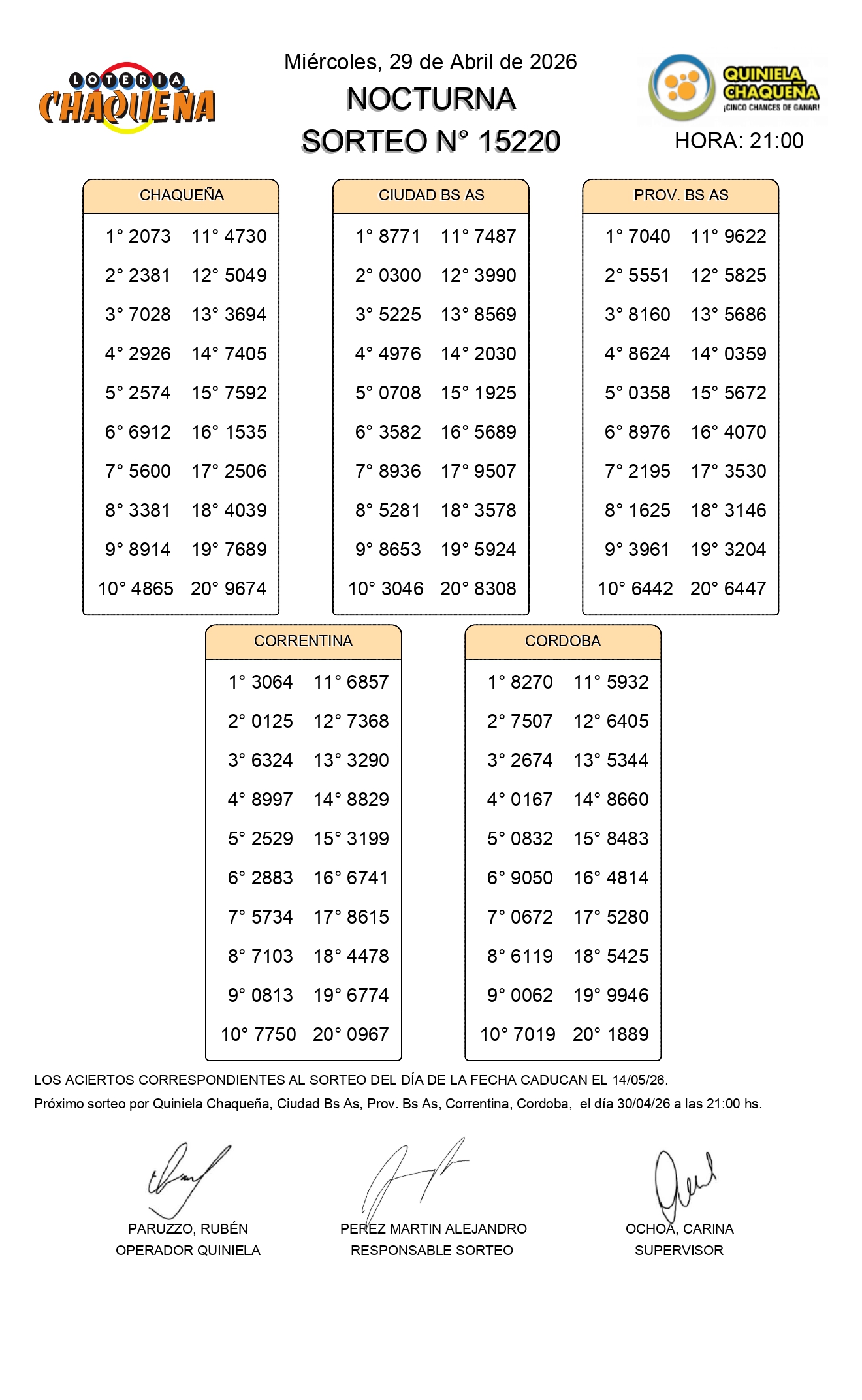 - N° de Sorteo: 15220