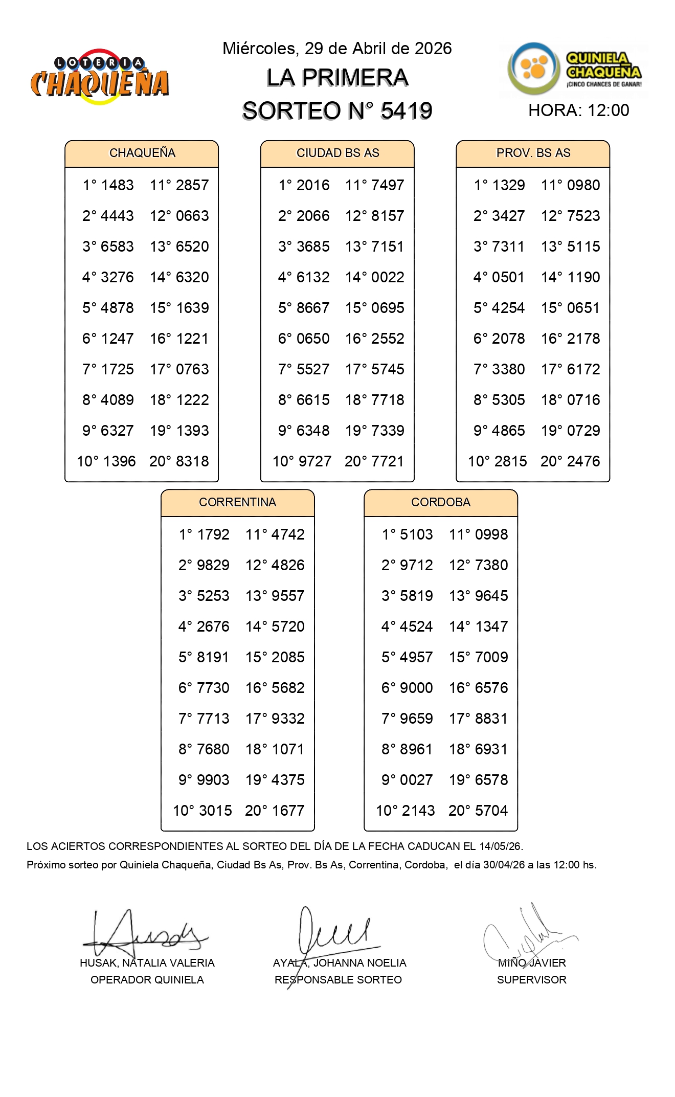 Nro de Sorteo: 5419