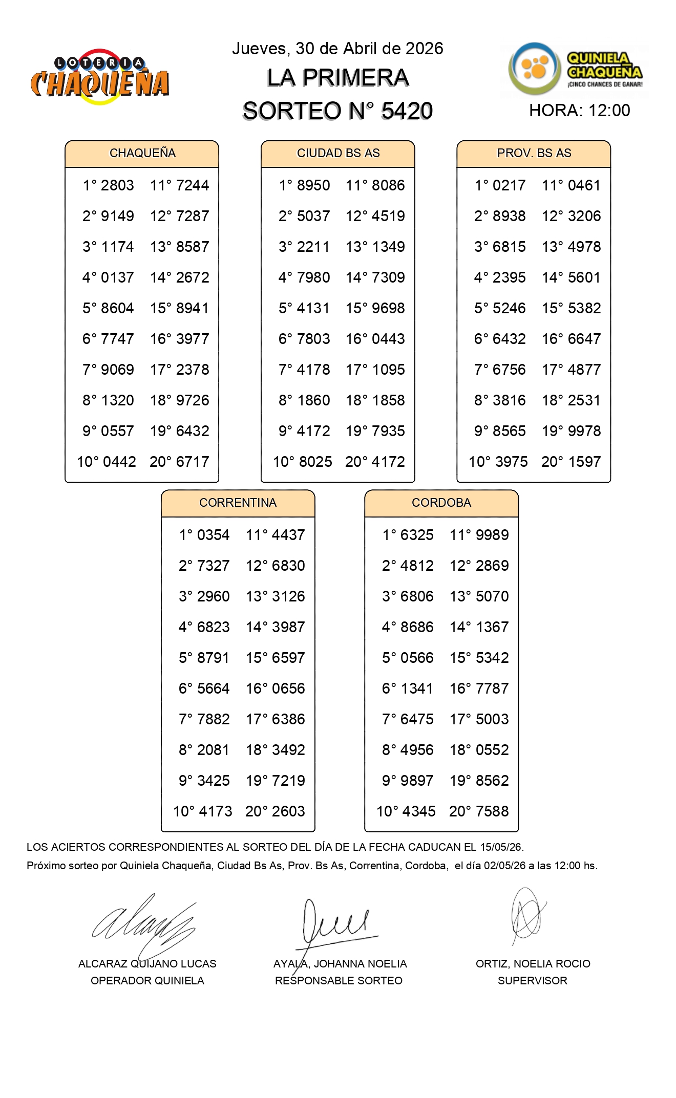 - N° de Sorteo: 5420